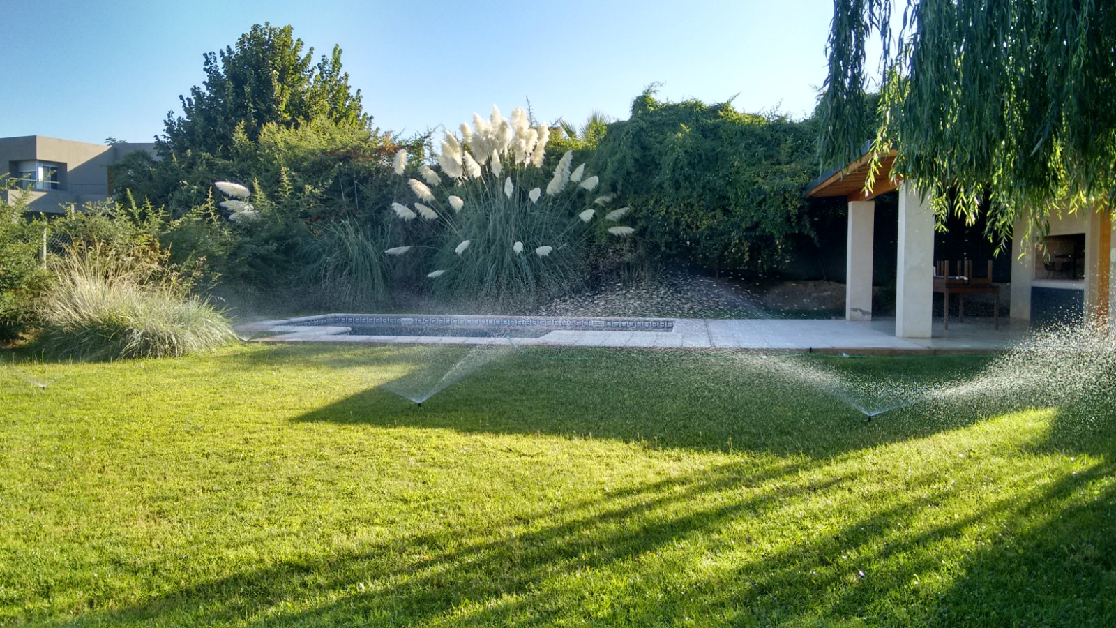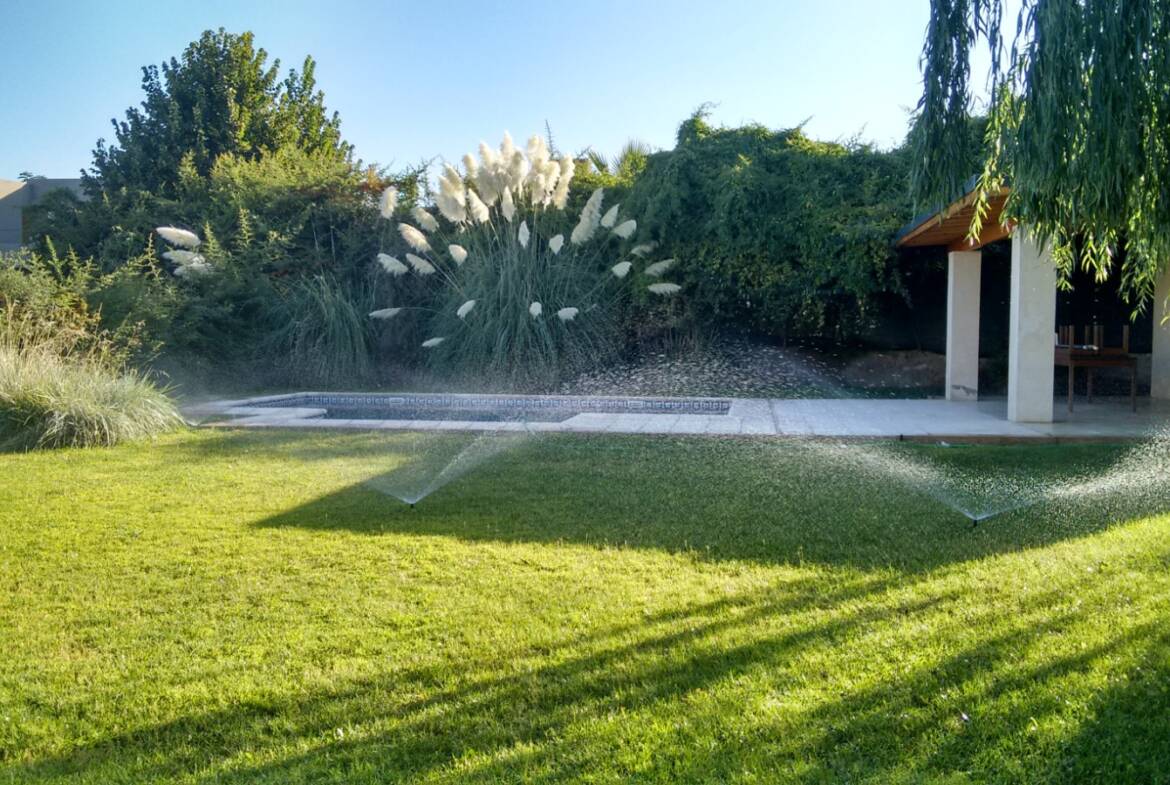 Jardín con riego por aspersión automatizado